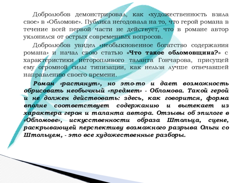Слайд 19Добролюбов демонстрировал, как «художественность взяла свое» в «Обломове». Публика негодовала на