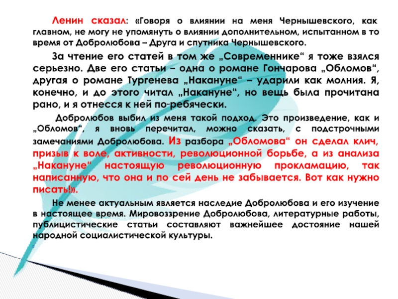 Слайд 26Ленин сказал: «Говоря о влиянии на меня Чернышевского, как главном, не