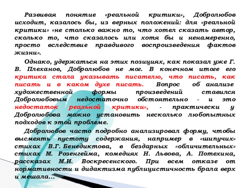 Однако, удержаться на этих позициях, как показал уже Г. В. Плеханов, Добролюбов не мог. В конечном итоге его критика стала указывать писателю, что писать, как писать и в каком духе писать. Вопрос об анализе художественной формы произведений ставился Добролюбовым недостаточно обстоятельно - и это недостаток реальной критики», - практически у Добролюбова можно установить несколько любопытных подходов к этой проблеме.