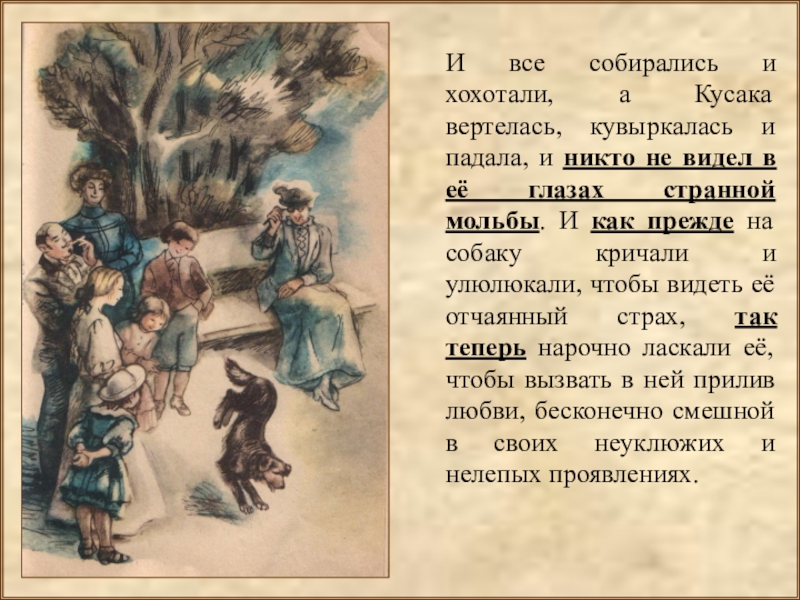 Слайд 12И все собирались и хохотали, а Кусака вертелась, кувыркалась и падала,