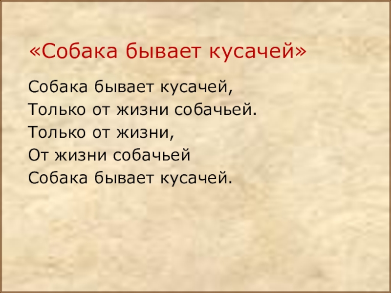 «Собака бывает кусачей»Собака бывает кусачей,Только от жизни собачьей.Только от жизни, От жизни собачьейСобака бывает кусачей.
