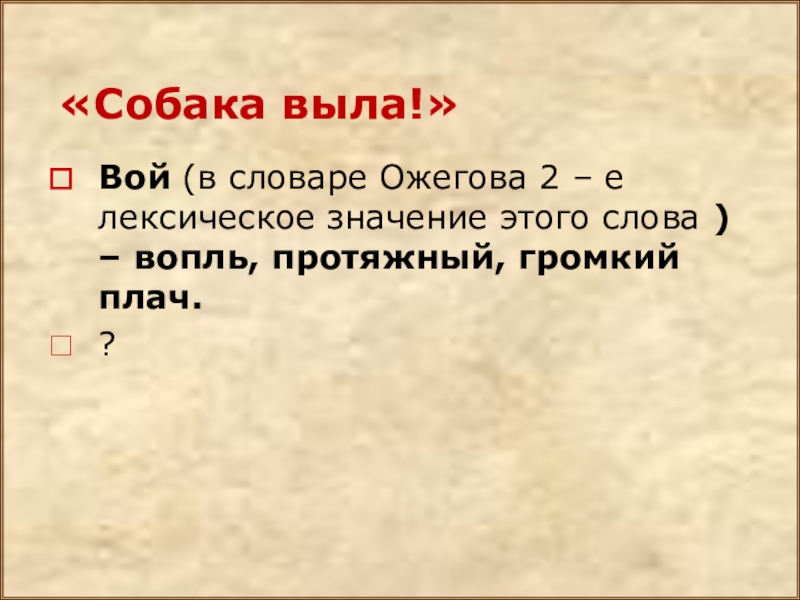 «Собака выла!»Вой (в словаре Ожегова 2 – е лексическое значение этого слова ) – вопль, протяжный, громкий