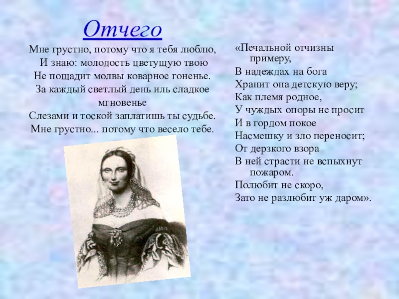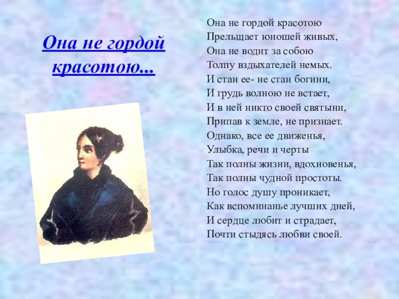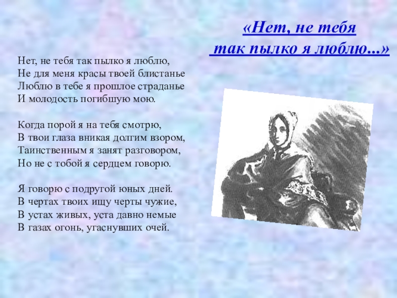 Он любит ее одну и верен ей одной. Это была глубокая привязанность, всю жизнь сопровождавшая поэта. Стихи, связанные с В. Лопухиной, объединяют два взаимосвязанных мотива: возвышенность одухотворенной личности лирической героини и самопожертвование героя ради ее счастья.