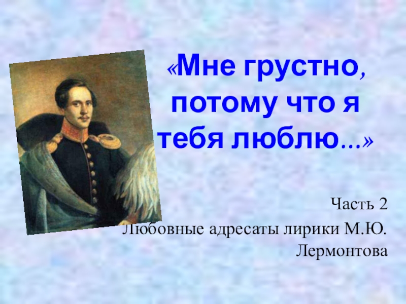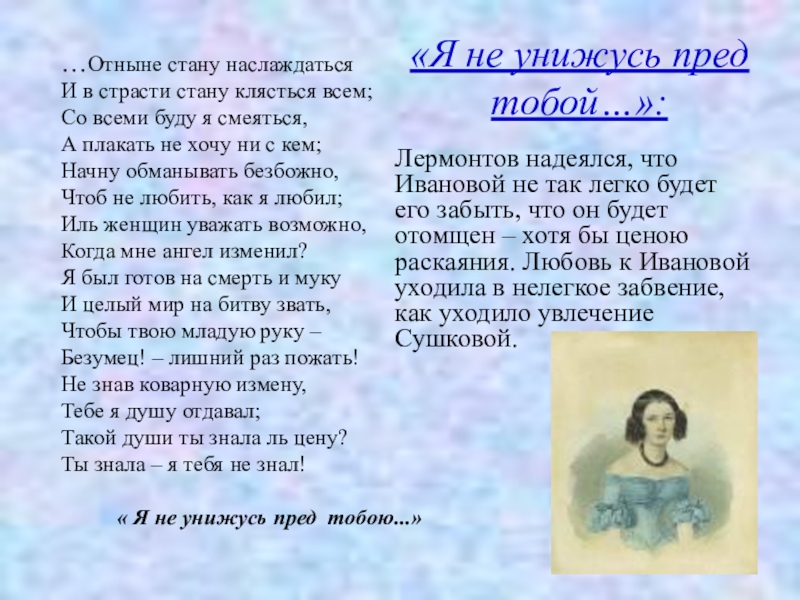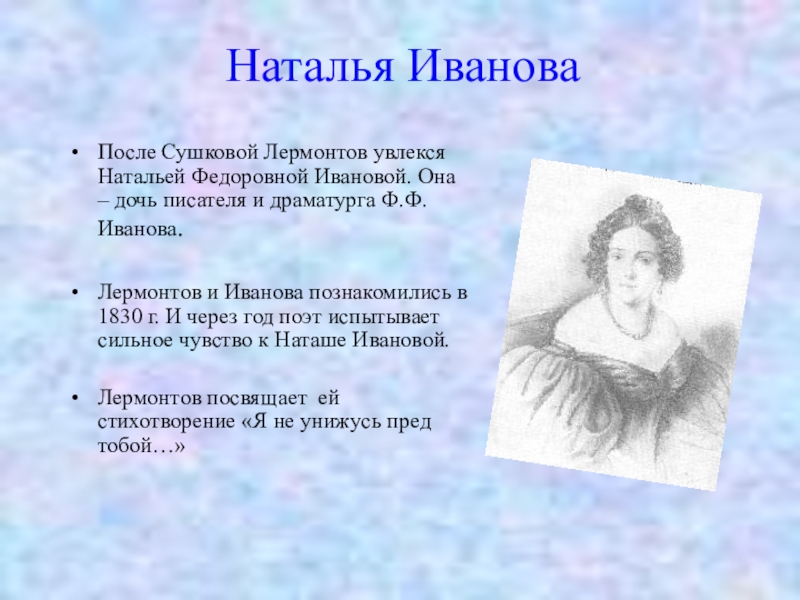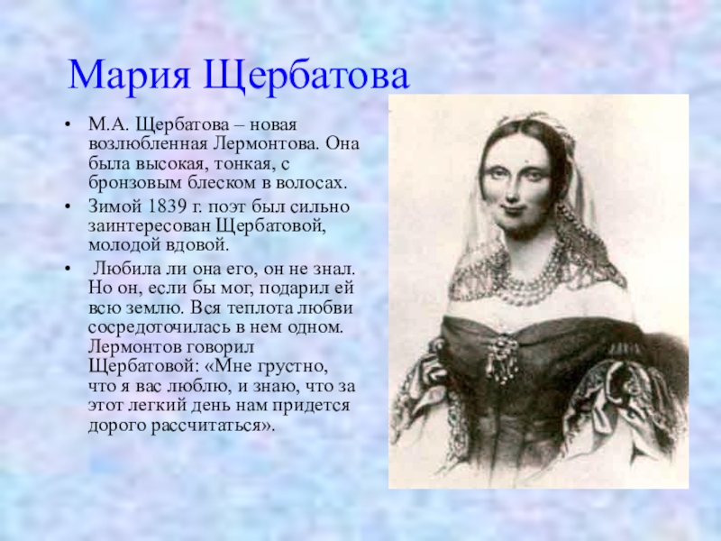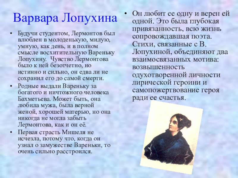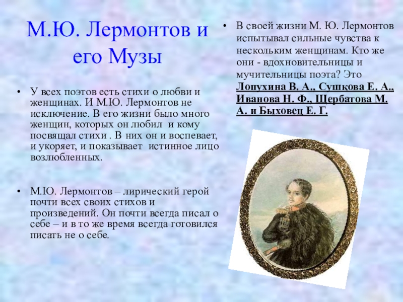 В своей жизни М. Ю. Лермонтов испытывал сильные чувства к нескольким женщинам. Кто же они - вдохновительницы и мучительницы поэта? Это Лопухина В. А., Сушкова Е. А., Иванова Н. Ф., Щербатова М. А. и Быховец Е. Г.