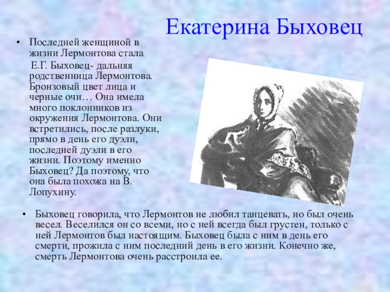 Быховец говорила, что Лермонтов не любил танцевать, но был очень весел. Веселился он со всеми, но с ней всегда был грустен, только с ней Лермонтов был настоящим. Быховец была с ним в день его смерти, прожила с ним последний день в его жизни. Конечно же, смерть Лермонтова очень расстроила ее.