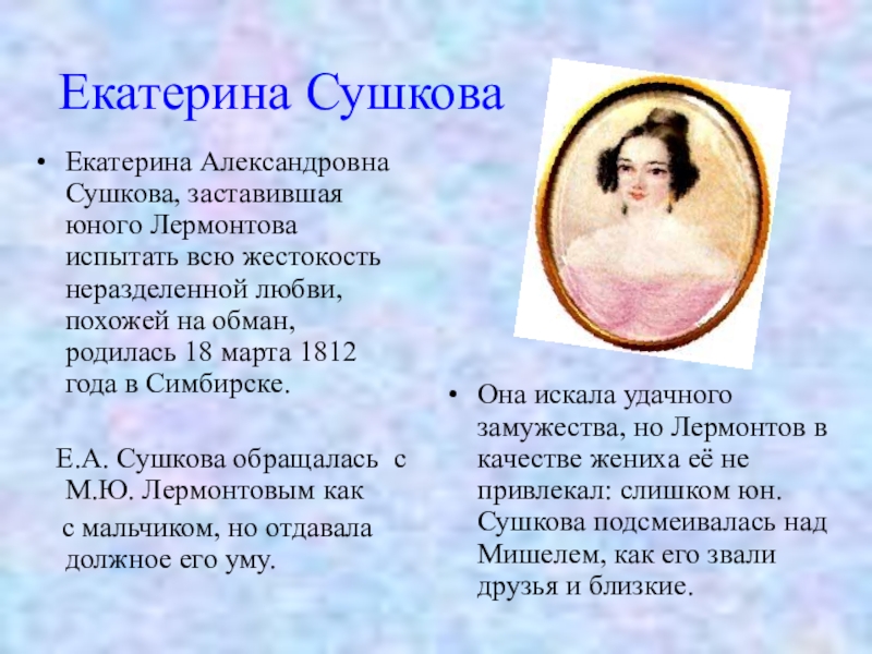 Она искала удачного замужества, но Лермонтов в качестве жениха её не привлекал: слишком юн. Сушкова подсмеивалась над Мишелем, как его звали друзья и близкие.