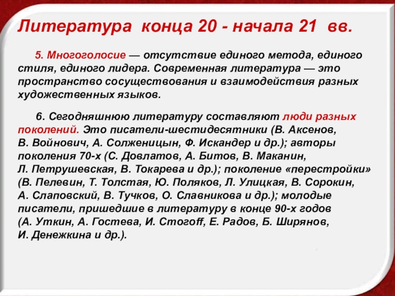 6. Сегодняшнюю литературу составляют люди разных поколений. Это писатели-шестидесятники (В. Аксенов, В. Войнович, А. Солженицын, Ф. Искандер и др.); авторы поколения 70-х (С. Довлатов, А. Битов, В. Маканин, Л. Петрушевская, В. Токарева и др.); поколение «перестройки» (В. Пелевин, Т. Толстая, Ю. Поляков, Л. Улицкая, В. Сорокин, А. Слаповский, В. Тучков, О. Славникова и др.); молодые писатели, пришедшие в литературу в конце 90-х годов (А. Уткин, А. Гостева, И. Cтoгoff, E. Радов, Б. Ширянов, И. Денежкина и др.).
