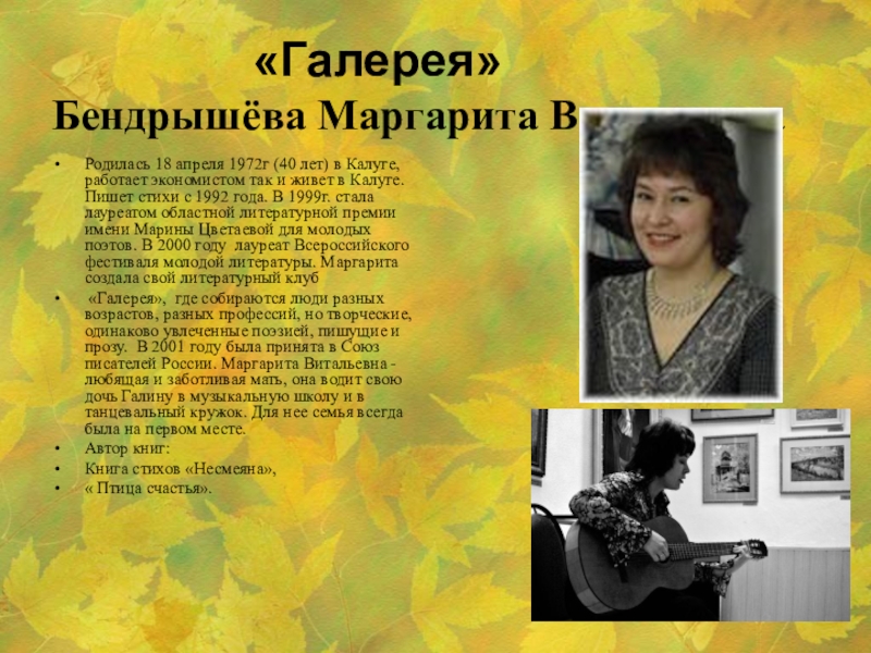 «Галерея», где собираются люди разных возрастов, разных профессий, но творческие, одинаково увлеченные поэзией, пишущие и прозу. В 2001 году была принята в Союз писателей России. Маргарита Витальевна - любящая и заботливая мать, она водит свою дочь Галину в музыкальную школу и в танцевальный кружок. Для нее семья всегда была на первом месте.