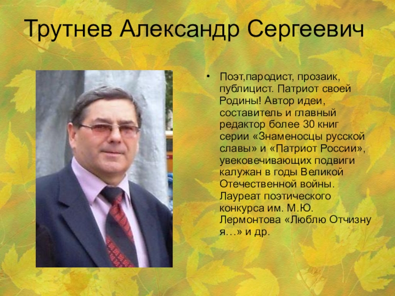 и главный редактор более 30 книг серии «Знаменосцы русской славы» и «Патриот России», увековечивающих подвиги калужан в годы Великой Отечественной войны. Лауреат поэтического конкурса им. М.Ю. Лермонтова «Люблю Отчизну я…» и др.