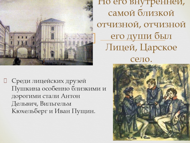 Но его внутренней, самой близкой отчизной, отчизной его души был Лицей, Царское село.