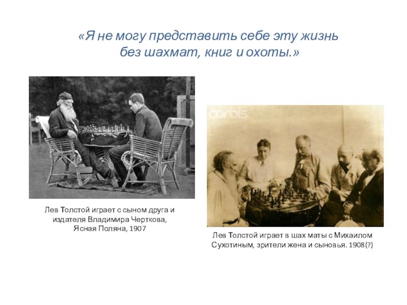 Лев Толстой играет в шах маты с Михаилом Сухотиным, зрители жена и сыновья. 1908(?)