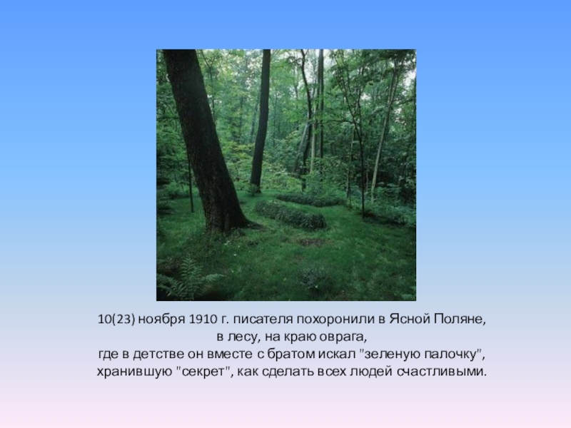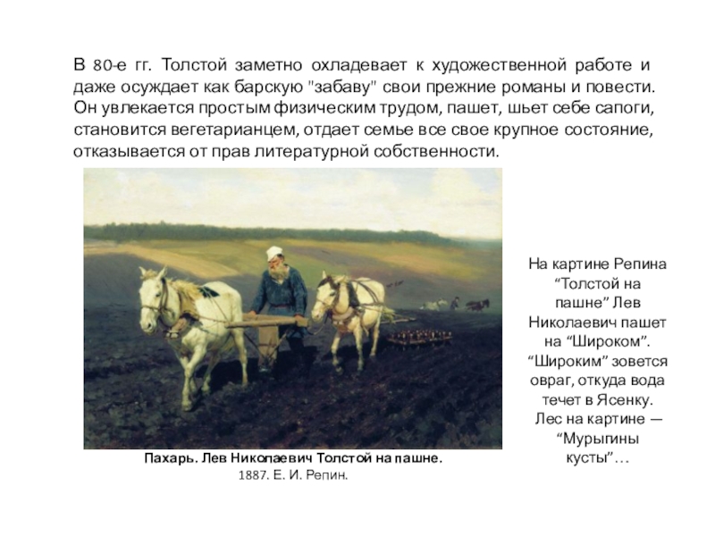На картине Репина “Толстой на пашне” Лев Николаевич пашет на “Широком”. “Широким” зовется овраг, откуда вода течет в Ясенку.