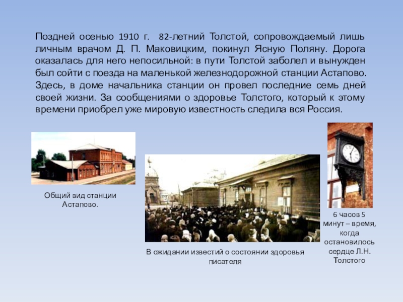 Поздней осенью 1910 г. 82-летний Толстой, сопровождаемый лишь личным врачом Д. П. Маковицким, покинул Ясную Поляну. Дорога оказалась для него непосильной: в пути Толстой заболел и вынужден был сойти с поезда на маленькой железнодорожной станции Астапово. Здесь, в доме начальника станции он провел последние семь дней своей жизни. За сообщениями о здоровье Толстого, который к этому времени приобрел уже мировую известность следила вся Россия.