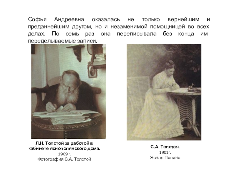 Софья Андреевна оказалась не только вернейшим и преданнейшим другом, но и незаменимой помощницей во всех делах. По семь раз она переписывала без конца им переделываемые записи.