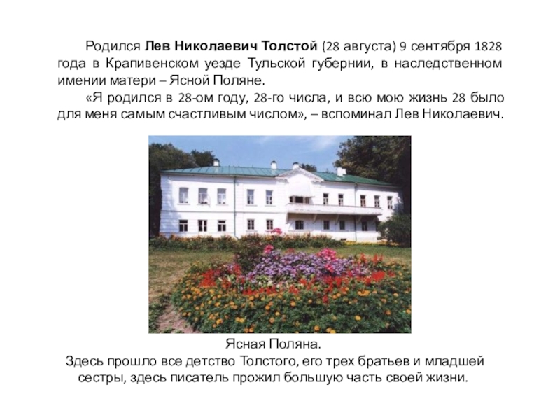 Родился Лев Николаевич Толстой (28 августа) 9 сентября 1828 года в Крапивенском уезде Тульской губернии, в наследственном имении матери – Ясной Поляне.