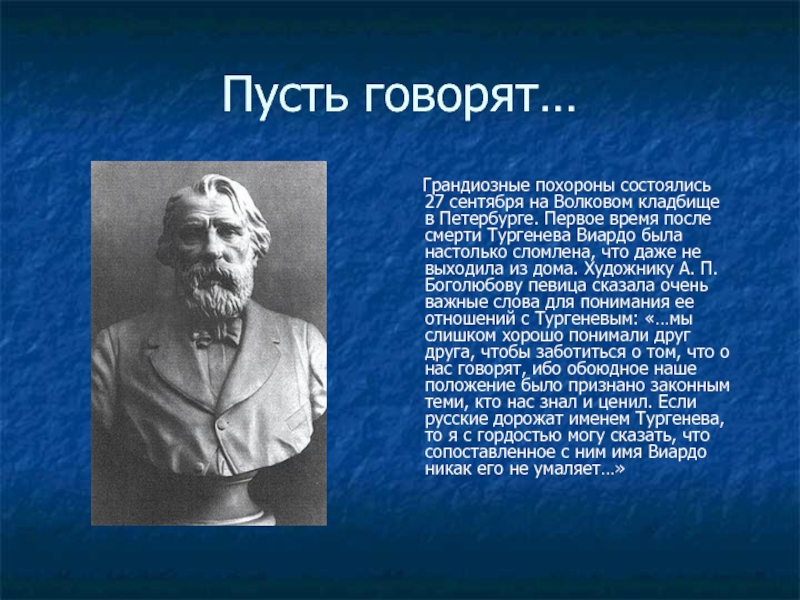 кладбище в Петербурге. Первое время после смерти Тургенева Виардо была настолько сломлена, что даже не выходила из дома. Художнику А. П. Боголюбову певица сказала очень важные слова для понимания ее отношений с Тургеневым: «…мы слишком хорошо понимали друг друга, чтобы заботиться о том, что о нас говорят, ибо обоюдное наше положение было признано законным теми, кто нас знал и ценил. Если русские дорожат именем Тургенева, то я с гордостью могу сказать, что сопоставленное с ним имя Виардо никак его не умаляет…»