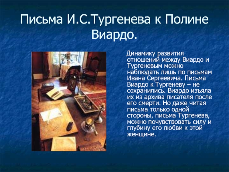 и Тургеневым можно наблюдать лишь по письмам Ивана Сергеевича. Письма Виардо к Тургеневу – не сохранились. Виардо изъяла их из архива писателя после его смерти. Но даже читая письма только одной стороны, письма Тургенева, можно почувствовать силу и глубину его любви к этой женщине.