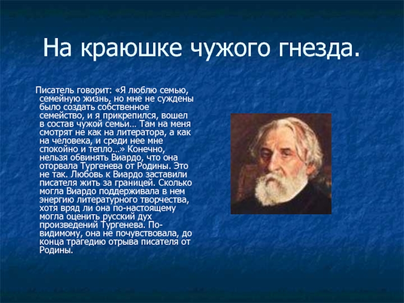семью, семейную жизнь, но мне не суждены было создать собственное семейство, и я прикрепился, вошел в состав чужой семьи… Там на меня смотрят не как на литератора, а как на человека, и среди нее мне спокойно и тепло…» Конечно, нельзя обвинять Виардо, что она оторвала Тургенева от Родины. Это не так. Любовь к Виардо заставили писателя жить за границей. Сколько могла Виардо поддерживала в нем энергию литературного творчества, хотя вряд ли она по-настоящему могла оценить русский дух произведений Тургенева. По-видимому, она не почувствовала, до конца трагедию отрыва писателя от Родины.