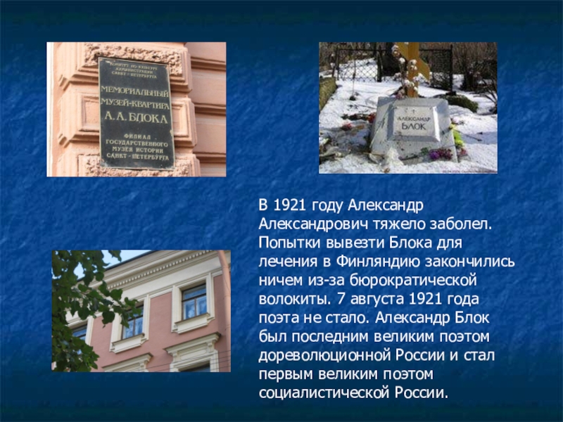 лечения в Финляндию закончились ничем из-за бюрократической волокиты. 7 августа 1921 года поэта не стало. Александр Блок был последним великим поэтом дореволюционной России и стал первым великим поэтом социалистической России.