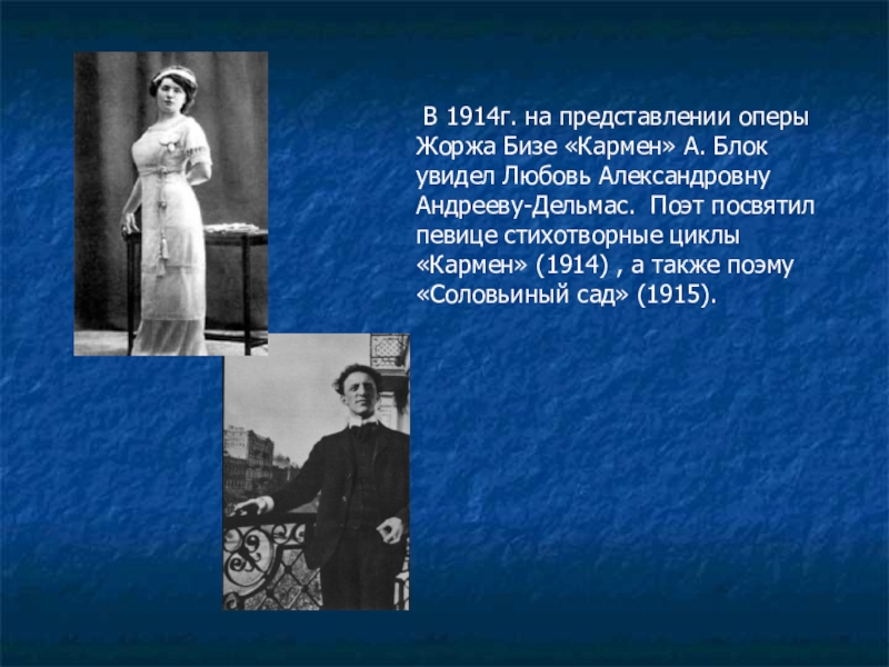 увидел Любовь Александровну Андрееву-Дельмас. Поэт посвятил певице стихотворные циклы «Кармен» (1914) , а также поэму «Соловьиный сад» (1915).