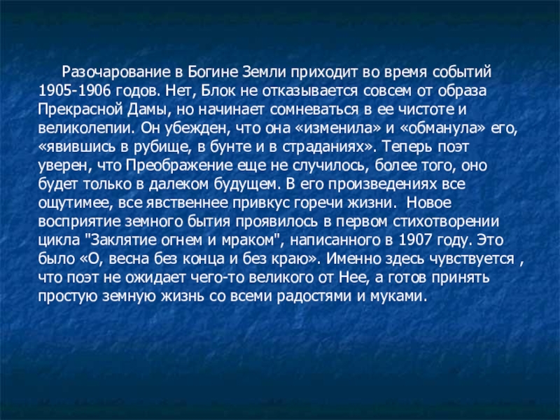1905-1906 годов. Нет, Блок не отказывается совсем от образа Прекрасной Дамы, но начинает сомневаться в ее чистоте и великолепии. Он убежден, что она «изменила» и «обманула» его, «явившись в рубище, в бунте и в страданиях». Теперь поэт уверен, что Преображение еще не случилось, более того, оно будет только в далеком будущем. В его произведениях все ощутимее, все явственнее привкус горечи жизни. Новое восприятие земного бытия проявилось в первом стихотворении цикла "Заклятие огнем и мраком", написанного в 1907 году. Это было «О, весна без конца и без краю». Именно здесь чувствуется , что поэт не ожидает чего-то великого от Нее, а готов принять простую земную жизнь со всеми радостями и муками.