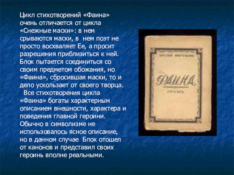 Все стихотворения цикла «Фаина» богаты характерным описанием внешности, характера и поведения главной героини. Обычно в символизме не использовалось ясное описание, но в данном случае Блок отошел от канонов и представил своих героинь вполне реальными.
