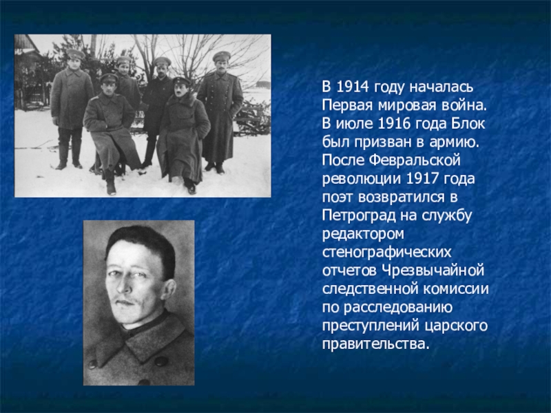 Блок был призван в армию. После Февральской революции 1917 года поэт возвратился в Петроград на службу редактором стенографических отчетов Чрезвычайной следственной комиссии по расследованию преступлений царского правительства.