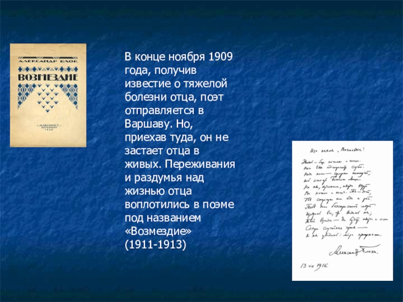 поэт отправляется в Варшаву. Но, приехав туда, он не застает отца в живых. Переживания и раздумья над жизнью отца воплотились в поэме под названием «Возмездие» (1911-1913)