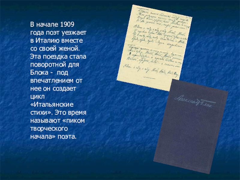 женой. Эта поездка стала поворотной для Блока - под впечатлением от нее он создает цикл «Итальянские стихи». Это время называют «пиком творческого начала» поэта.