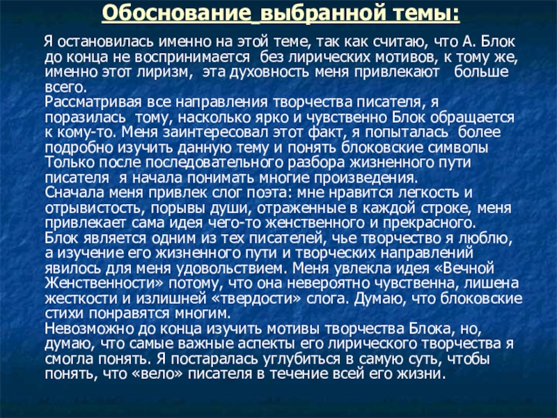 Блок является одним из тех писателей, чье творчество я люблю, а изучение его жизненного пути и творческих направлений явилось для меня удовольствием. Меня увлекла идея «Вечной Женственности» потому, что она невероятно чувственна, лишена жесткости и излишней «твердости» слога. Думаю, что блоковские стихи понравятся многим.