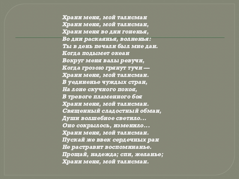 Храни меня, мой талисманХрани меня, мой талисман,Храни меня во дни гоненья,Во дни раскаянья, волненья:Ты в день печали был мне дан.Когда подымет океанВокруг меня валы ревучи,Когда грозою грянут тучи —Храни меня, мой талисман.В уединенье чуждых стран,На лоне скучного покоя,В тревоге