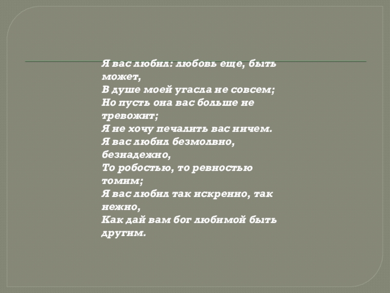 Я вас любил: любовь еще, быть может, В душе моей угасла не совсем; Но пусть она вас