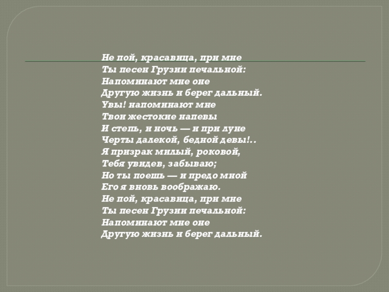 Не пой, красавица, при мнеТы песен Грузии печальной:Напоминают мне онеДругую жизнь и берег дальный.Увы! напоминают мнеТвои жестокие напевыИ степь, и ночь