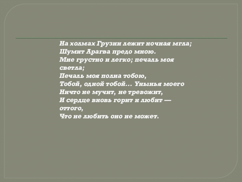 На холмах Грузии лежит ночная мгла;Шумит Арагва предо мною.Мне грустно и легко; печаль моя светла;Печаль моя полна тобою,Тобой, одной тобой... Унынья моегоНичто