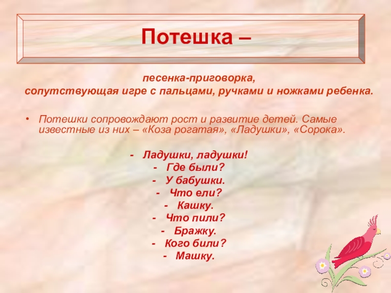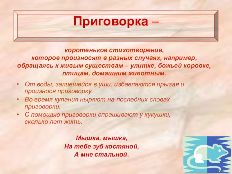 которое произносят в разных случаях, например, обращаясь к живым существам – улитке, божьей коровке, птицам, домашним животным.