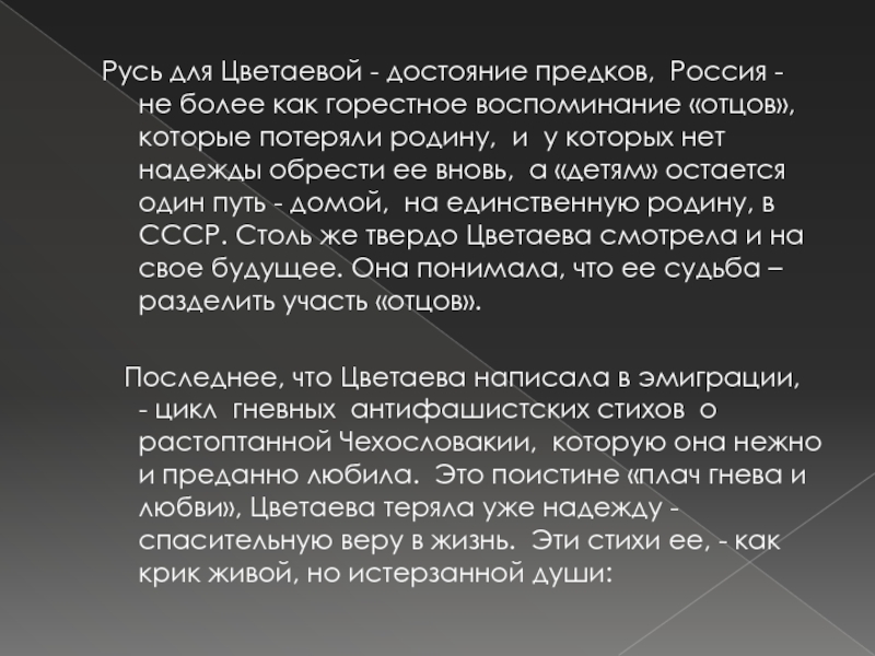 Последнее, что Цветаева написала в эмиграции, - цикл гневных антифашистских стихов о растоптанной Чехословакии, которую она нежно и преданно любила. Это поистине «плач гнева и любви», Цветаева теряла уже надежду - спасительную веру в жизнь. Эти стихи ее, - как крик живой, но истерзанной души: