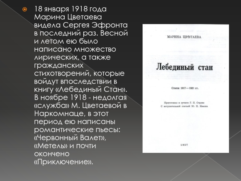 раз. Весной и летом ею было написано множество лирических, а также гражданских стихотворений, которые войдут впоследствии в книгу «Лебединый Стан». В ноябре 1918 - недолгая «служба» М. Цветаевой в Наркомнаце, в этот период ею написаны романтические пьесы: «Червонный Валет», «Метель» и почти окончено «Приключение».