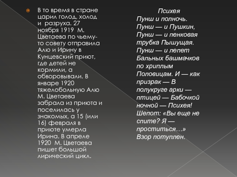 ноября 1919 М. Цветаева по чьему-то совету отправила Алю и Ирину в Кунцевский приют, где детей не кормили, а обворовывали. В январе 1920 тяжелобольную Алю М. Цветаева забрала из приюта и поселилась у знакомых, а 15 (или 16) февраля в приюте умерла Ирина. В апреле 1920 М. Цветаева пишет большой лирический цикл.