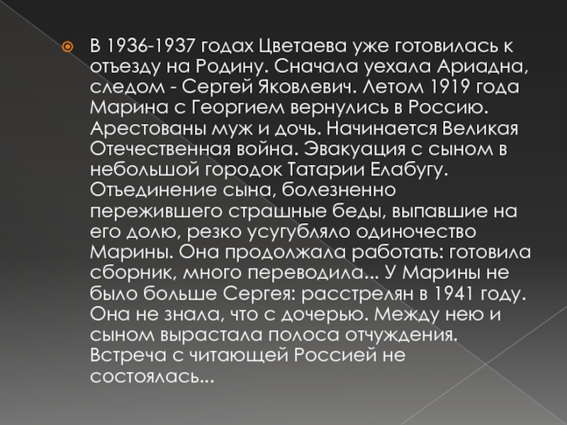 уехала Ариадна, следом - Сергей Яковлевич. Летом 1919 года Марина с Георгием вернулись в Россию. Арестованы муж и дочь. Начинается Великая Отечественная война. Эвакуация с сыном в небольшой городок Татарии Елабугу. Отъединение сына, болезненно пережившего страшные беды, выпавшие на его долю, резко усугубляло одиночество Марины. Она продолжала работать: готовила сборник, много переводила... У Марины не было больше Сергея: расстрелян в 1941 году. Она не знала, что с дочерью. Между нею и сыном вырастала полоса отчуждения. Встреча с читающей Россией не состоялась...