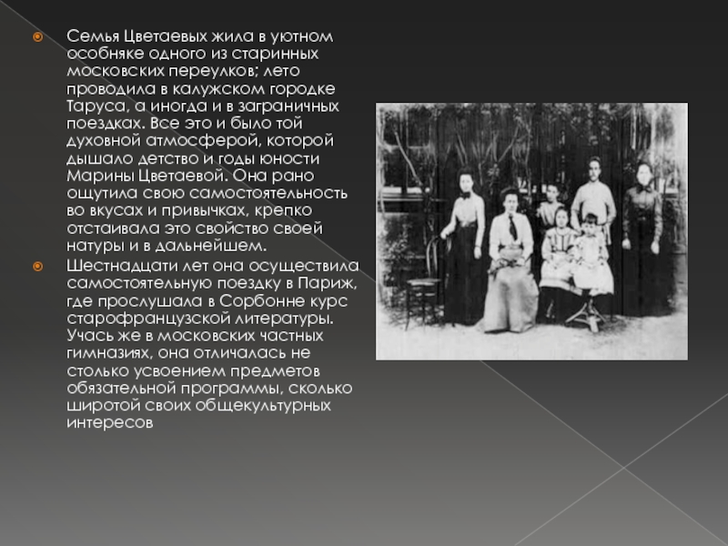 Слайд 4Семья Цветаевых жила в уютном особняке одного из старинных московских переулков;