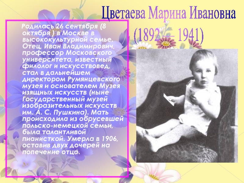 Слайд 3 Детские годы Цветаевой прошли в Москве и