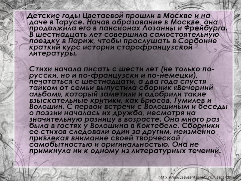 лето проводила в калужском городке Таруса, а иногда и в заграничных поездках. Все это и было той духовной атмосферой, которой дышало детство и годы юности Марины Цветаевой. Она рано ощутила свою самостоятельность во вкусах и привычках, крепко отстаивала это свойство своей натуры и в дальнейшем.