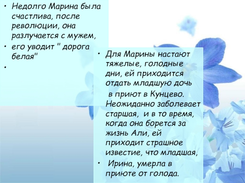 Для Марины настают тяжелые, голодные дни, ей приходится отдать младшую дочь
