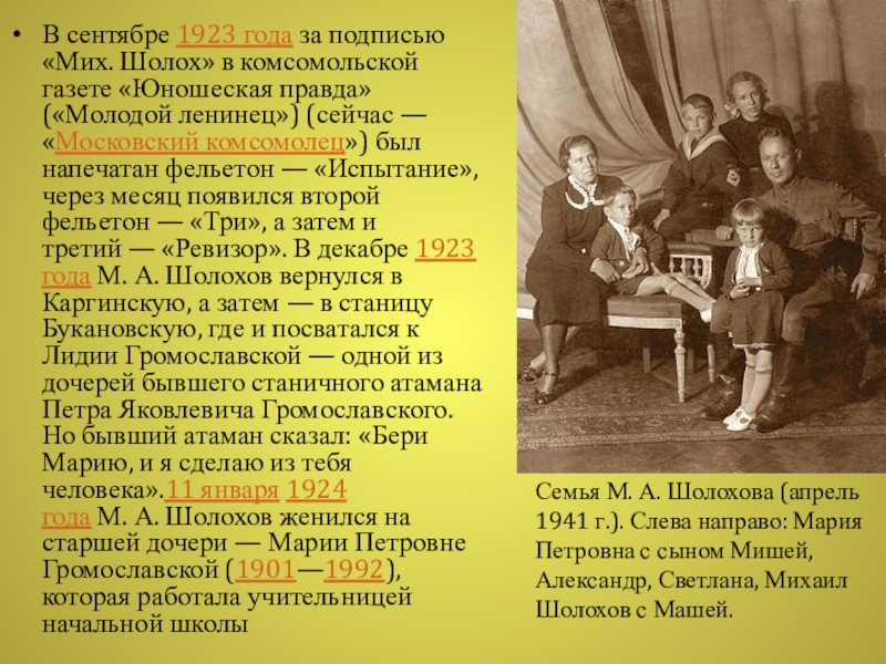 Семья М. А. Шолохова (апрель 1941 г.). Слева направо: Мария Петровна с сыном Мишей, Александр, Светлана, Михаил Шолохов с Машей.