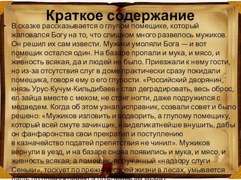 то, что слишком много развелось мужиков. Он решил их сам извести. Мужики умоляли Бога — и вот помещик остался один. На базаре пропали и мука, и мясо, и живность всякая, да и людей не было. Приезжали к нему гости, но из-за отсутствия слуг в доме практически сразу покидали помещика, говоря ему о его глупости. «Российский дворянин, князь Урус-Кучум-Кильдибаев» стал деградировать, весь оброс, ел зайца вместе с мехом, не стриг ногти, даже подружился с медведем. Когда об этом узнал исправник, созвали совет и было решено: «Мужиков изловить и водворить, а глупому помещику, который всей смуте зачинщик, наиделикатнейше внушить, дабы он фанфаронства свои прекратил и поступлению в казначейство податей препятствия не чинил». Мужиков вернули в уезд, и на базаре снова появились и мука, и мясо, и живность всякая; а помещик, порученный «надзору слуги Сеньки», тоскует по прежней своей жизни в лесах, умывается лишь по принуждению и по временам мычит.