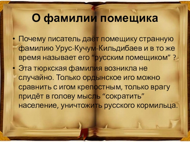 Почему писатель даёт помещику странную фамилию Урус-Кучум-Кильдибаев и в