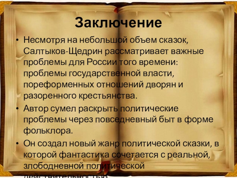 Несмотря на небольшой объем сказок, Салтыков-Щедрин рассматривает важные проблемы для России