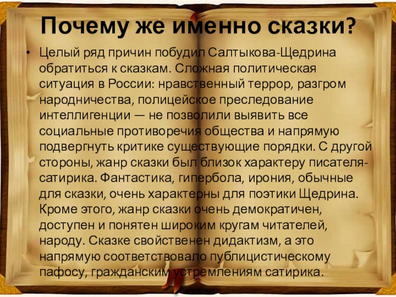 Сложная политическая ситуация в России: нравственный террор, разгром народничества, полицейское преследование интеллигенции — не позволили выявить все социальные противоречия общества и напрямую подвергнуть критике существующие порядки. С другой стороны, жанр сказки был близок характеру писателя-сатирика. Фантастика, гипербола, ирония, обычные для сказки, очень характерны для поэтики Щедрина. Кроме этого, жанр сказки очень демократичен, доступен и понятен широким кругам читателей, народу. Сказке свойственен дидактизм, а это напрямую соответствовало публицистическому пафосу, гражданским устремлениям сатирика.