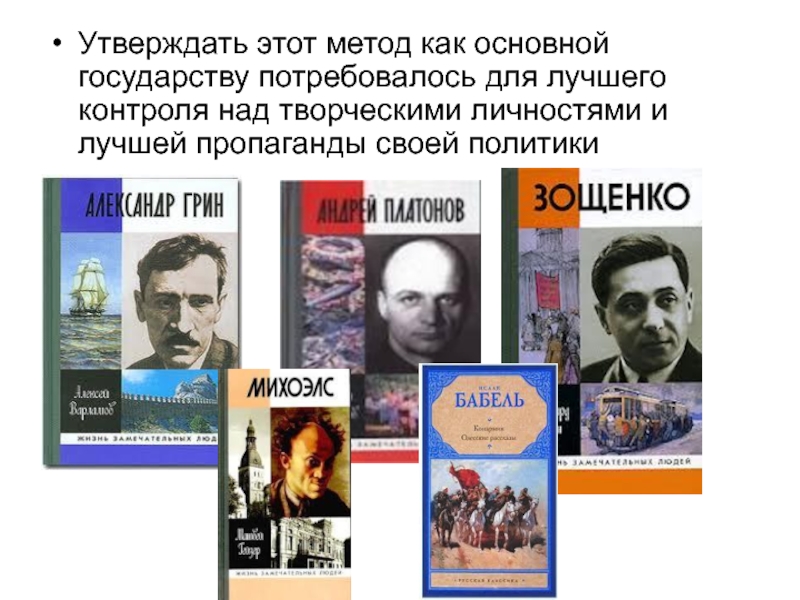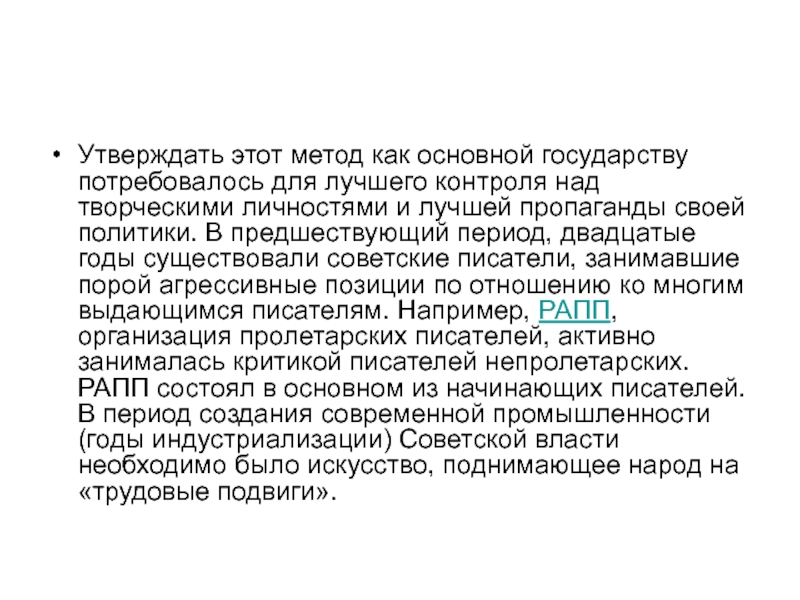 творческими личностями и лучшей пропаганды своей политики. В предшествующий период, двадцатые годы существовали советские писатели, занимавшие порой агрессивные позиции по отношению ко многим выдающимся писателям. Например, РАПП, организация пролетарских писателей, активно занималась критикой писателей непролетарских. РАПП состоял в основном из начинающих писателей. В период создания современной промышленности (годы индустриализации) Советской власти необходимо было искусство, поднимающее народ на «трудовые подвиги».
