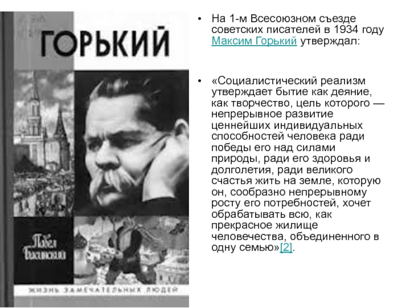 «Социалистический реализм утверждает бытие как деяние, как творчество, цель которого — непрерывное развитие ценнейших индивидуальных способностей человека ради победы его над силами природы, ради его здоровья и долголетия, ради великого счастья жить на земле, которую он, сообразно непрерывному росту его потребностей, хочет обрабатывать всю, как прекрасное жилище человечества, объединенного в одну семью»[2].